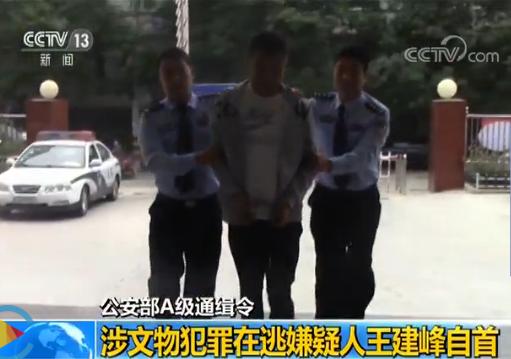 王建峰系陜西省咸陽市淳化縣公安機關正在偵辦的一起重大文物案件的主犯之一。2016年11月10日,陜西省淳化縣公安機關對王建峰作出刑事拘留決定并進行網上追逃,此后開展了大量摸排、研判、查緝等工作,但一直未能抓獲。7月31日公安部發布A級通緝令通緝10名重大文物犯罪逃犯后,淳化縣公安機關進一步加大緝捕力度,同時安排民警做其家屬思想工作,督促其主動投案自首,爭取從寬處理。在公安機關的全力緝捕和工作施壓下,王建峰向陜西省淳化縣公安機關投案自首。