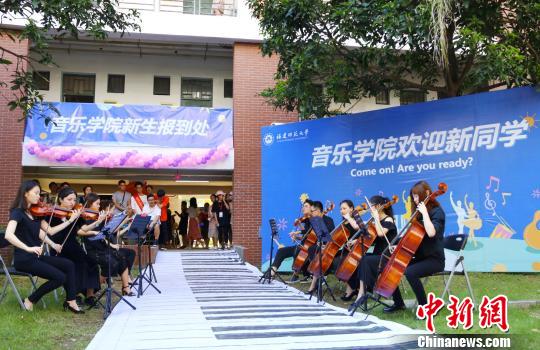 16日,記者探訪了福建師范大學(xué)南區(qū),就聽見迎新點(diǎn)傳來優(yōu)雅的《歡樂頌》,不少新生及家長聽到琴聲都提著行李停下腳步,駐足觀看。原來這是福建師范大學(xué)音樂學(xué)院充分發(fā)揮專業(yè)優(yōu)勢開展的特色迎新。
