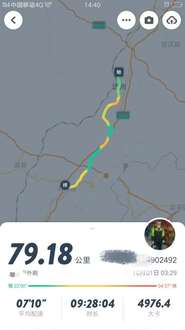 王浪:跑之前看地圖顯示73公里左右,預計步行需要17個小時多。但我用跑步軟件記錄的,從學校到大竹縣雙馬車站,跑了79.18公里,總計花了9個小時28分,包括了中途休息、補充能量所需的時間。