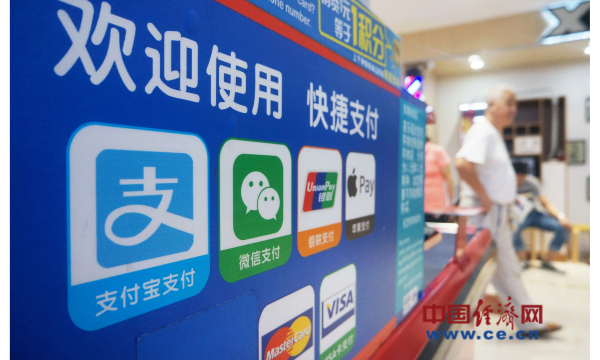 資料圖片:2017年9月6日,顧客從杭州一家超市的微信支付、支付寶等非銀支付標識前走過。