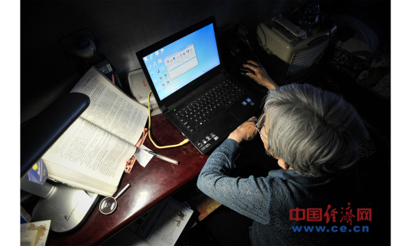 資料圖片:2017年5月17日,天津。薛敏修在利用電腦學習。2014年,78歲的薛敏修正式成為天津大學現代遠程教育電子商務專業的本科學生。