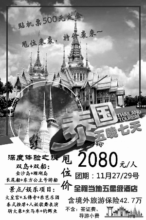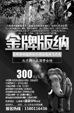 記者來到位于青年路一處老舊小區(qū)的北京金色陽光旅行社,咨詢?yōu)楦改笀?bào)名旅行團(tuán),工作人員立即拿出手機(jī),將其中幾條線路海報(bào)電子版給記者看,其中一張是去泰國的,“現(xiàn)在去泰國天氣暖和,老人們都喜歡。年底我們大促銷,原價(jià)都是3000多,現(xiàn)在只要2000元。”此外,對方還拿出來一張去西雙版納的旅行宣傳冊,上面寫著“雙飛6天僅需300元”。銷售人員告訴記者,這個(gè)團(tuán)價(jià)格便宜十分緊俏,但是需要至少5人一同報(bào)名才能享受這個(gè)價(jià)格,但當(dāng)記者提出要和老人同行后,卻遭到了工作人員的拒絕。“這個(gè)團(tuán)是我們專門為老人打造的,要求60歲以上的老人才能參加。”當(dāng)記者詢問是否有自費(fèi)項(xiàng)目或者是否保證出團(tuán)時(shí),工作人員又顧左右而言他:“這個(gè)機(jī)會(huì)十分緊俏,您要是給老人報(bào)名要盡快。”