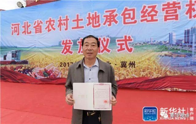 衡水市冀州區莊子頭村村民魏九明在展示領到的《農村土地承包經營權證》(4月19日攝)。4月19日,河北省農村土地承包經營權確權登記首批頒證儀式在衡水市冀州區莊子頭村舉行,14戶村民領到《農村土地承包經營權證》。新華社記者 王曉 攝
