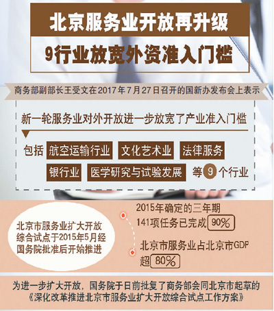 此次《決定》調整的內容涉及金融、航空運輸、文化娛樂、音像制品制作等相關服務業。這是繼2017年6月,國務院同意繼續推進北京市服務業擴大開放綜合試點后,又陸續發布的服務業開放舉措之一。