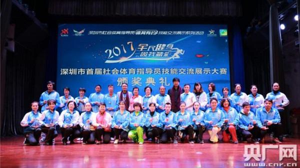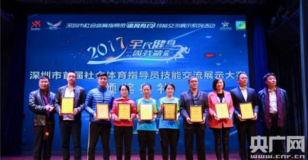 央廣網深圳1月7日消息(記者于鑫淼)2018年1月6日,深圳迎來了一個全民健身的重磅大禮——首屆社會體育指導員技能交流展示大賽頒獎典禮。深圳數百位體育指導員及體育義工們齊聚深圳大學,共同見證這場屬于他們榮耀的盛宴。頒獎典禮上,深圳市文體旅游局嘉獎了社會體育指導員技能交流展示大賽的獲獎集體、個人、服務點、優秀體育義工、優秀社會體育指導員。其中,部分獲獎項目在典禮上進行了展演。這場旨在致敬社會體育指導員和體育義工的盛宴,也是對2017年深圳首屆社會體育指導員技能交流展示大賽進行總結表彰。