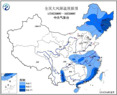 中新網1月8日電 中央氣象臺今日6時繼續發布寒潮藍色預警:受較強冷空氣影響,8至9日,陜西南部、黃淮南部、江漢、江淮、江南中東部、華南中東部、云南東部以及內蒙古中東部、東北地區大部等地氣溫將下降6~8℃。