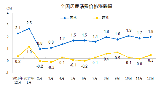 2017年12月份,全國(guó)居民消費(fèi)價(jià)格同比上漲1.8%。其中,城市上漲1.9%,農(nóng)村上漲1.7%;食品價(jià)格下降0.4%,非食品價(jià)格上漲2.4%;消費(fèi)品價(jià)格上漲1.1%,服務(wù)價(jià)格上漲3.0%。