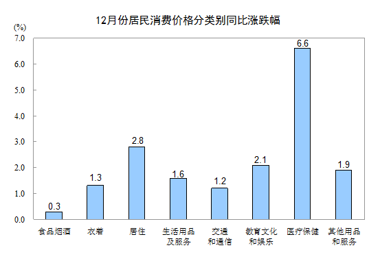 12月份,其他七大類(lèi)價(jià)格同比均上漲。其中,醫(yī)療保健、居住、教育文化和娛樂(lè)價(jià)格分別上漲6.6%、2.8%和2.1%,其他用品和服務(wù)、生活用品及服務(wù)價(jià)格分別上漲1.9%和1.6%,衣著、交通和通信價(jià)格分別上漲1.3%和1.2%。