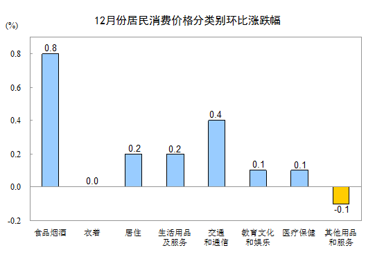12月份,其他七大類(lèi)價(jià)格環(huán)比五漲一降一平。其中,交通和通信價(jià)格上漲0.4%,居住、生活用品及服務(wù)價(jià)格均上漲0.2%,教育文化和娛樂(lè)、醫(yī)療保健價(jià)格均上漲0.1%;其他用品和服務(wù)價(jià)格下降0.1%;衣著價(jià)格持平。