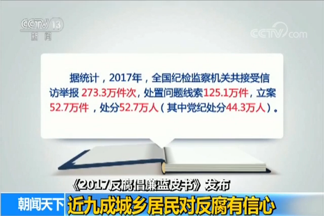 央視網消息:昨天,中國社科院中國廉政研究中心在京發布《2017反腐倡廉藍皮書》, 對十八大以來的全國黨風廉政建設和反腐敗工作進行了全面梳理,分析了社會認同和期待。調查顯示,我國近九成城鄉居民對黨風廉政建設和反腐敗斗爭有信心。