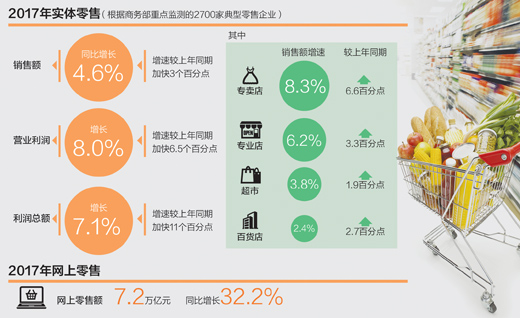 商務部近日發布的數據顯示,去年我國實體零售發展態勢良好,重點監測的2700家典型企業銷售額同比增長4.6%,增速較上年同期加快3個百分點。去年我國網上零售額突破7.2萬億元,同比增長32.2%。