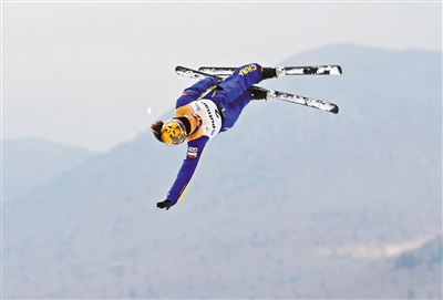 自由式滑雪空中技巧,要求運動員從平臺躍起到落地的空間內做各種空翻轉體動作。自由式滑雪的得分是根據表演的藝術效果和競技水平決定的,比賽時每人試跳兩次,裁判員根據運動員完成動作的質量評定空中動作分和著陸動作分,兩者相加再乘以動作難度系數,即為一次試跳的得分,兩次試跳得分相加,得分多者名次高。