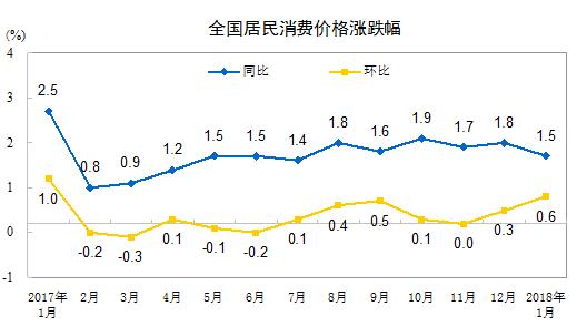 央廣網北京2月9日消息 國家統計局今日公布2018年1月份居民消費價格,數據顯示, 2018年1月份,全國居民消費價格同比上漲1.5%。其中,城市上漲1.5%,農村上漲1.5%;食品價格下降0.5%,非食品價格上漲2.0%;消費品價格上漲1.0%,服務價格上漲2.3%。