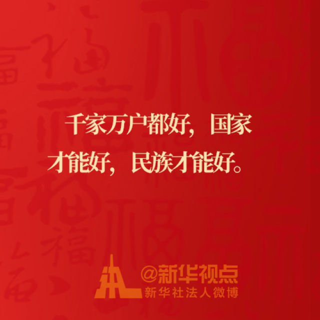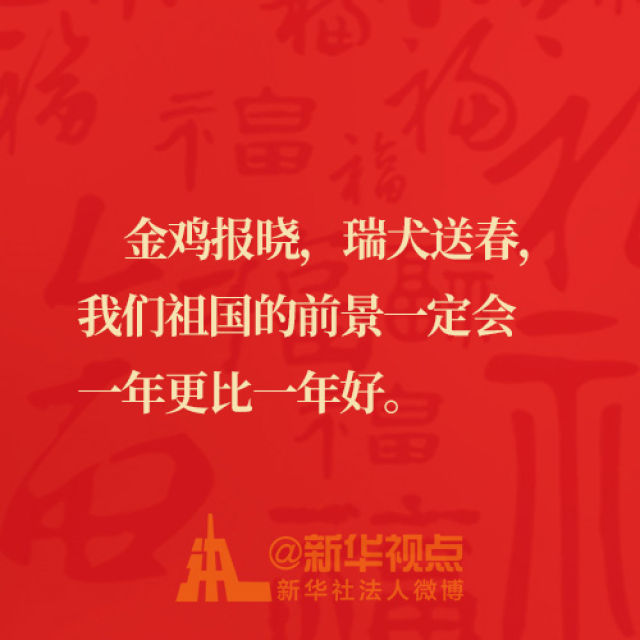 習近平總書記在2018年春節團拜會上發表重要講話說:① 我們祖國的前景一定會一年更比一年好。②春節是新的開始,預示著新的希望。③千家萬戶都好,國家才能好,民族才能好。④奮斗者是精神最為富足的人。⑤新時代是奮斗者的時代。一起品味、學習總書記的新春金句