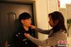 年初一早上,母親為即將踏上行程的孔令揚整理著裝。這位平凡的母親,在萬家團圓的日子,和丈夫及兒子都是聚少離多。胡宏 攝 -
