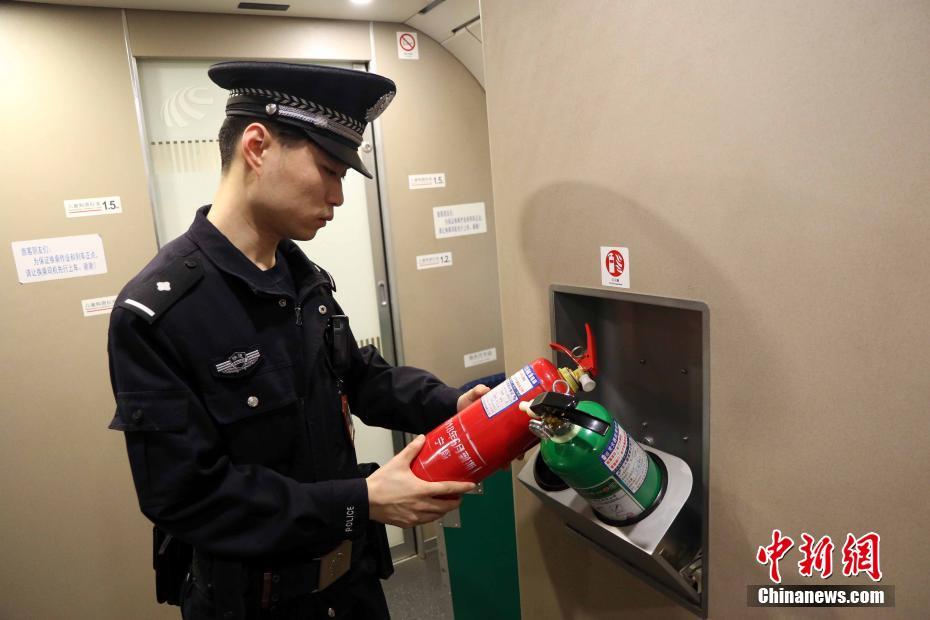 孔令揚在列車上檢查消防安全設施。胡宏 攝 -