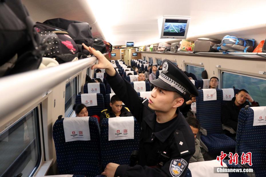 孔令揚是南寧鐵路公安處乘警支隊一名普通的乘警,今年28歲,家在山東濟南,父親曾是一名鐵路警察。平時,這名年輕的“90”后鐵警,不停地來往于南寧和濟南之間,與妻子和父母過著聚少離多的“雙城”生活,每月只有6個晚上在家。今年大年三十和初一正好是他值班,大年三十晚上20時40分,孔令揚值乘的G434次高鐵列車才到達濟南西站,孔令揚趕緊趕回家與父母團聚。2月16日(年初一)早上6時,他即從家里出發,趕到濟南西站,值乘上午8時15分由濟南西開往南寧東的G433次列車。孔令揚只能和父母相聚不到8個小時,沒來得及和妻子一起去岳母娘家省親。孔令揚只是南寧鐵路公安處大年夜值乘民警中的一員,今年大年夜和年初一,南寧鐵路公安處共有40多名民警堅守在崗位上。胡宏 攝 -