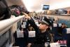 孔令揚在列車上幫助旅客檢查行李物品。胡宏 攝 -
