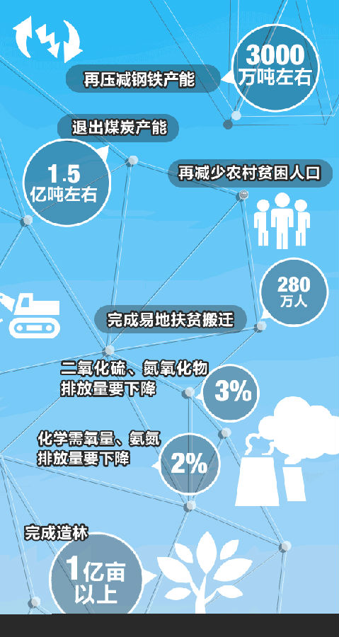 去產能:再壓減鋼鐵產能3000萬噸左右,退出煤炭產能1.5億噸左右。