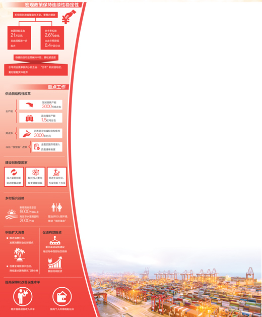 “穩”主要體現在:自十八大以來,我國財政赤字率安排已連續四年增長且近兩年始終保持在3%的水平。穩定赤字預期,鞏固近年來在管控地方政府債務方面取得的積極成效,并為未來中央宏觀調控預留充裕的財政空間!斑M”主要體現在:通過優化財政支出結構,更多向創新驅動、“三農”、民生等領域傾斜,實現精準扶持,主要體現為結構性增支赤字。
