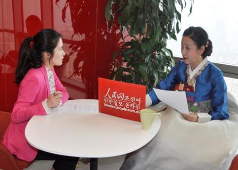 訪談前,全國人大代表咸順女(右)與人民網記者金洪花進行溝通。(人民網任英花攝)