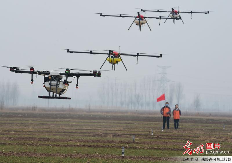 隨著氣溫回升,北方地區農業生產進入春季繁忙時節。國家糧食增產工程"渤海糧倉"河北滄州項目區泊頭市付村的冬小麥進入病蟲害防治、灌溉追肥管理階段,當地啟用大量無人機進行大范圍噴灑農藥、營養液作業,大幅度提高了作業效率與噴灑的精準度。(傅新春攝/光明圖片)