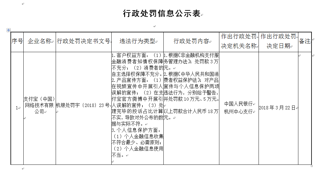 人民網北京4月9日電 據中國人民銀行網站杭州中心支行消息,昨日,中國人民銀行杭州中心支行根據《非金融機構支付服務管理辦法》,對支付寶(中國)網絡技術有限公司處罰款3萬元;根據《中華人民共和國消費者權益保護法》,對支付寶(中國)網絡技術有限公司產品宣傳與個人信息保護兩項違法行為,分別給予警告,并處罰款10萬元、5萬元。罰款合計18萬元。