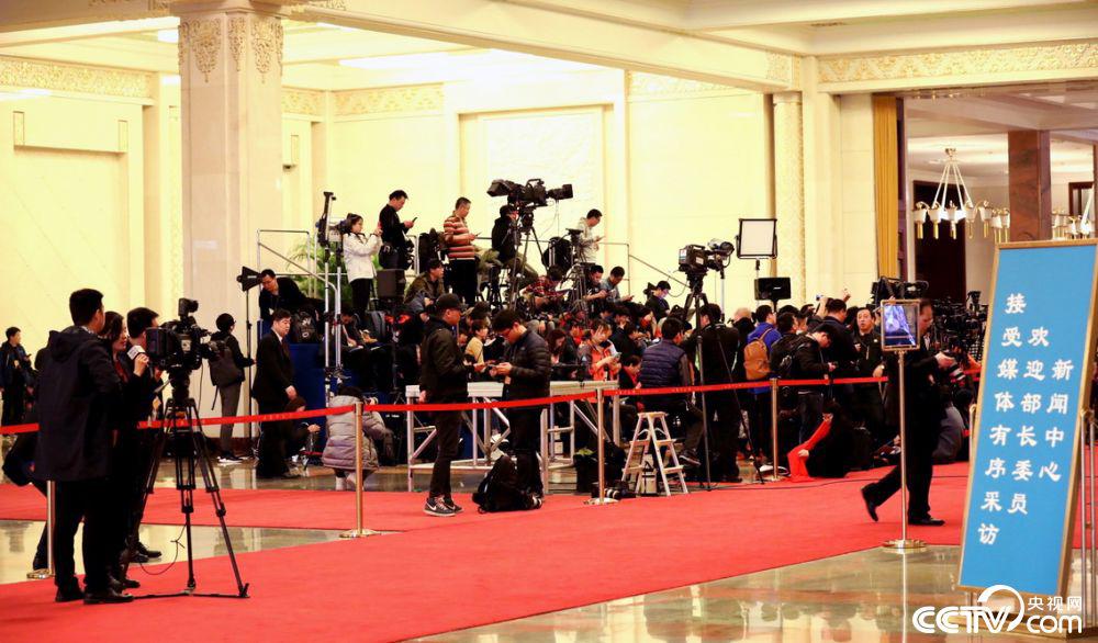 2018年部長(zhǎng)通道”開(kāi)啟前,中外媒體記者提前就位“排兵布陣”。(圖片來(lái)源:央視網(wǎng))