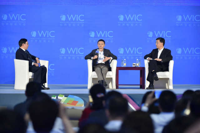 5月16日,阿里巴巴集團(tuán)董事局主席馬云(中)在天津舉行的第二屆世界智能大會主論壇上就人工智能的現(xiàn)狀與未來進(jìn)行發(fā)言。新華社記者 李然 攝