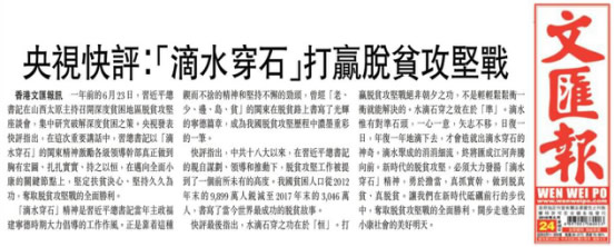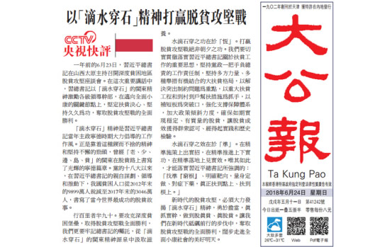 央視網消息:6月24日,香港《文匯報》和香港《大公報》同時轉發了中央廣播電視總臺央視新聞刊播的《央視快評》。文章指出,一年前的6月23日,習近平總書記在山西太原主持召開深度貧困地區脫貧攻堅座談會,集中研究破解深度貧困之策。在這次重要講話中,習總書記以“滴水穿石”的閩東精神激勵各級領導干部真正做到胸有宏圖、扎扎實實、持之以恒,在邁向全面小康的關鍵節點上,堅定扶貧決心、堅持久久為功,奪取脫貧攻堅戰的全面勝利。報道內容如下: