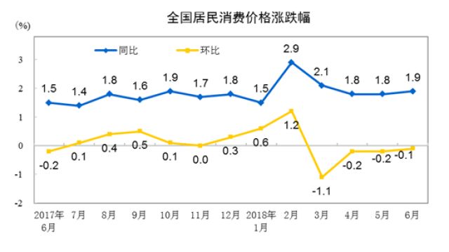 2018年6月份,全國居民消費價格同比上漲1.9%。其中,城市上漲1.8%,農(nóng)村上漲1.9%;食品價格上漲0.3%,非食品價格上漲2.2%;消費品價格上漲1.5%,服務(wù)價格上漲2.4%。上半年,全國居民消費價格比去年同期上漲2.0%。
