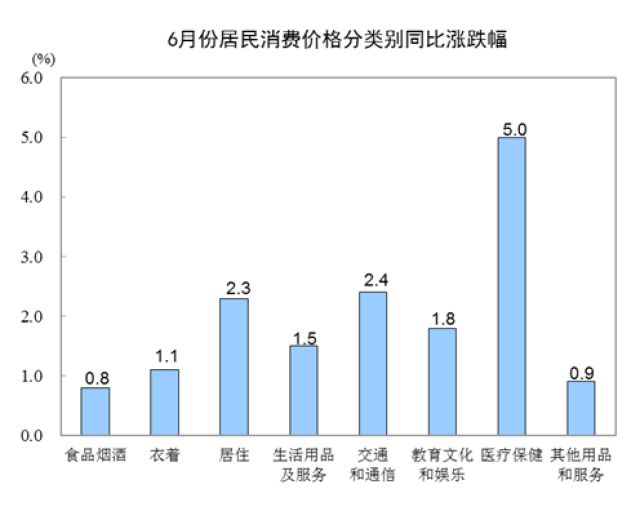 其他七大類價格同比均上漲。其中,醫(yī)療保健、交通和通信、居住價格分別上漲5.0%、2.4%和2.3%,教育文化和娛樂、生活用品及服務(wù)價格分別上漲1.8%和1.5%,衣著、其他用品和服務(wù)價格分別上漲1.1%和0.9%。