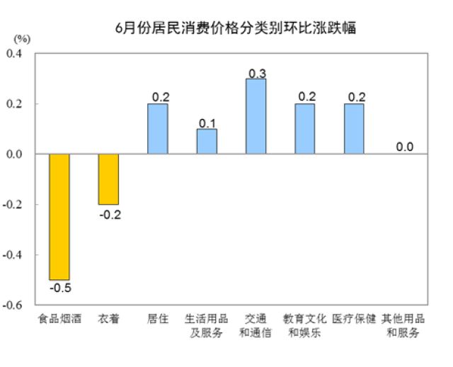 6月份,全國居民消費價格環(huán)比下降0.1%。其中,城市持平,農(nóng)村下降0.1%;食品價格下降0.8%,非食品價格上漲0.1%;消費品價格下降0.2%,服務(wù)價格上漲0.2%。