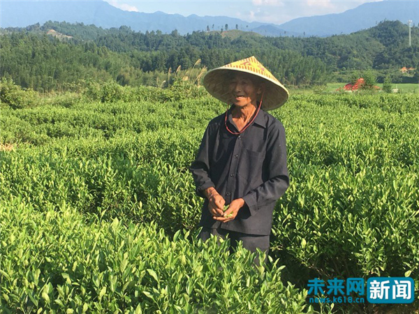 村民在井岡山新城鎮黃金茶基地采茶,說起收入非常開心。未來網記者 楊佩穎攝。