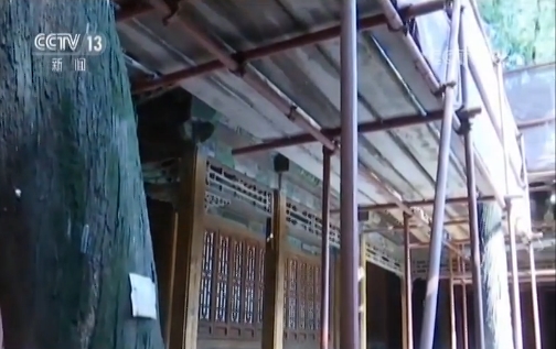 故宮博物院古建部楊紅說,支頂的過程中,大木構件它會稍微有一些歪閃或者晃動,有可能這些彩畫有一些剝落、剝離的這種現象,所以我們在這個擷芳亭大木加固之前、支頂之前,我們對彩畫這部分要對它進行預加固。