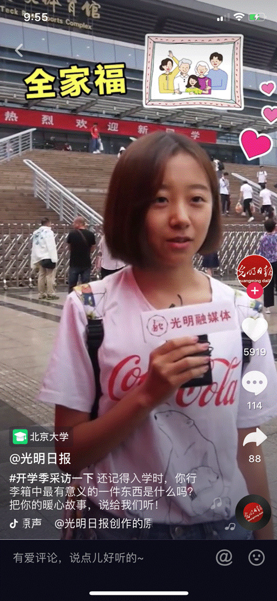 光明日報記者則來到北京大學,對00后新生和老生們進行了街頭采訪。當問及“入學時,行李箱里最有意義的一件東西時”,有的說是全家福,有的說是電吉他,還有愛好二次元的同學帶了最喜歡的手辦來到學校。
