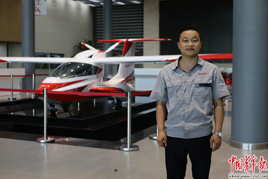 上海浦東臨港科技城,某航空公司副總王仕國在完全具有自主知識產權的國產水陸兩棲小飛機前。