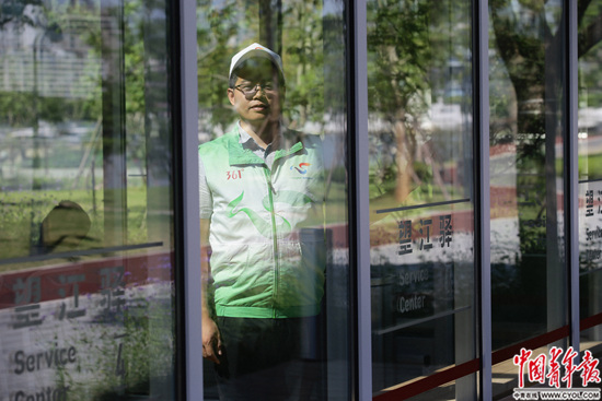 上海浦東濱江大道望江驛服務站,31歲的志愿者吳躍武。這里每公里都有一座帶衛生間、圖書室的免費驛站。