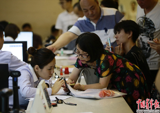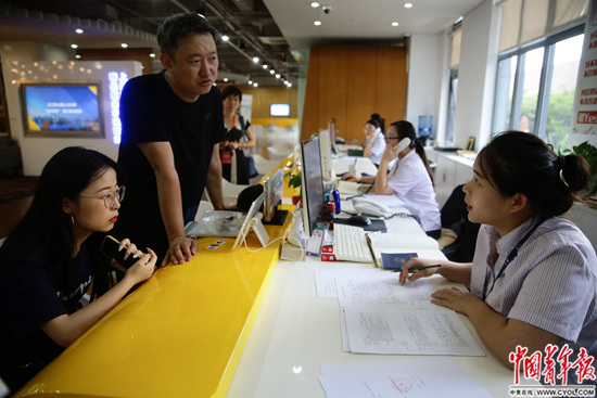 8月29日,上海浦東國際人才城,來自臺灣的郭先生(左二)正在咨詢辦理工作居住證的相關事宜。