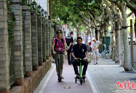 8月31日,上海浦東碧云國際社區,布魯和伊拉里亞夫婦騎著電動滑板車準備接孩子放學。據介紹,這個社區外籍人士家庭占90%左右。