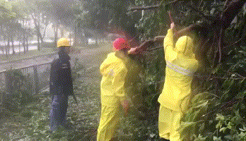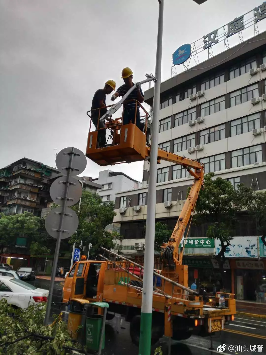 ▲臺風來臨之際,汕頭市城照中心的工作人員,正在對被風吹倒的路燈進行應急處置。