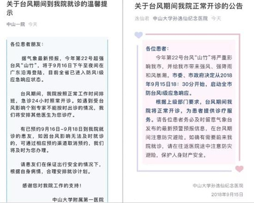 ▲各大醫(yī)院發(fā)布通知,臺風期間正常上班、照常開診。