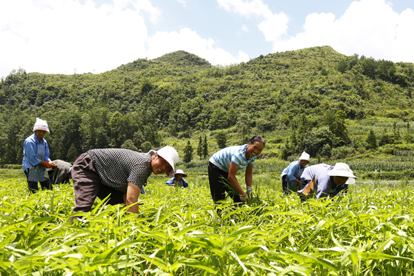 7月11日,在長順縣代化鎮納傍村一塊蔬菜基地上,一群當地村民正忙著除草。來自周邊睦化村60歲的韋小瓊,每天早上六點起床,七點半吃完早餐就來納傍村蔬菜基地務工。“到這里來做活,多少得點零用錢,離家近很方便。”說起在這里務工的好處,韋小瓊樂呵呵的說,“現在比以前好多了,以前又苦又累都沒得一碗好飯吃,來這里打工一天70塊,可以有點小用錢!边@是納傍村脫貧攻堅產業發展帶動的一個縮影。
