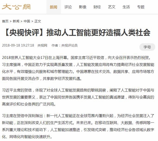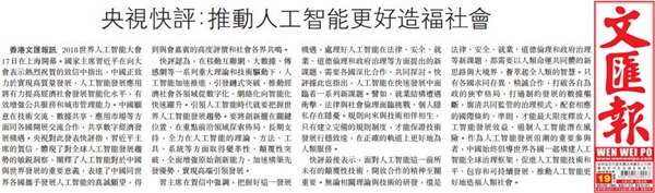 央視網消息:9月18日至19日,香港《文匯報》和香港《大公報》網站轉發了中央廣播電視總臺央視新聞18日刊播的《央視快評:推動人工智能更好造福人類社會》。報道內容如下: