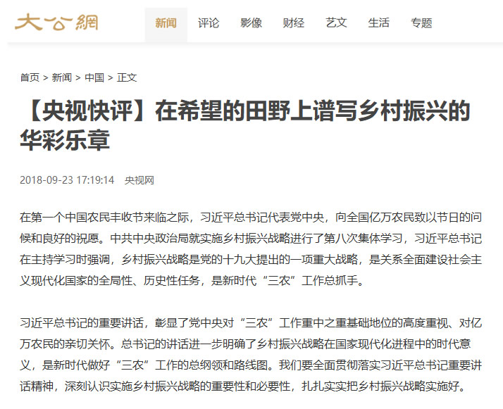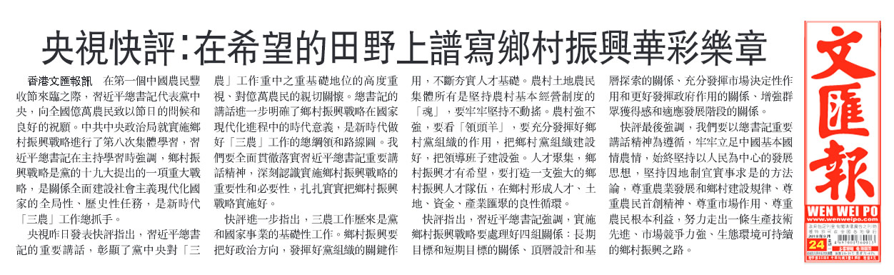 央視網消息:9月23日至24日,香港《文匯報》和香港《大公報》網站轉發了中央廣播電視總臺央視新聞23日刊播的《央視快評:在希望的田野上譜寫鄉村振興的華彩樂章》。報道內容如下: