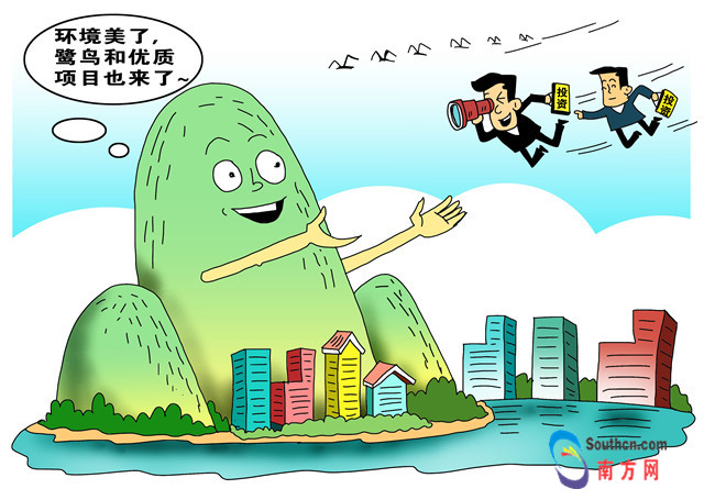 落實綠色發展理念,村民一邊享受著天藍、地綠、水凈的優質環境,另一邊也分享著經濟快速發展帶來的“金山銀山”。(漫畫作者:朱慧卿)