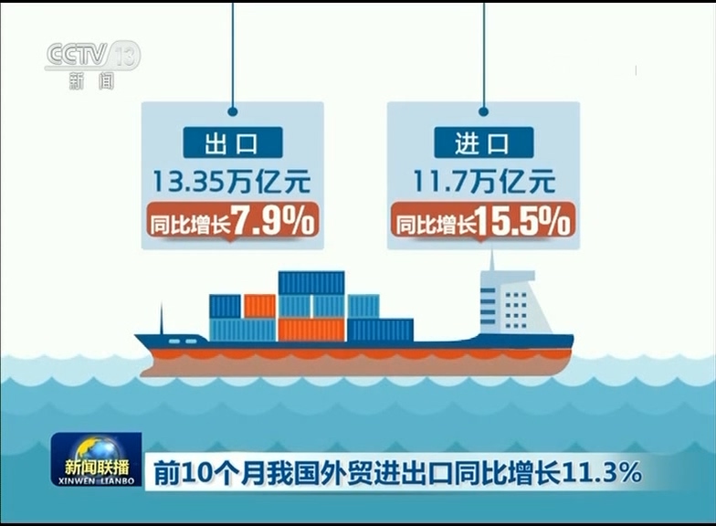 央視網(wǎng)消息(新聞聯(lián)播):海關(guān)總署今天公布:今年前10個(gè)月,我國(guó)貨物貿(mào)易進(jìn)出口總值25.05萬(wàn)億元人民幣,同比增長(zhǎng)11.3%。其中,出口13.35萬(wàn)億元,同比增長(zhǎng)7.9%,進(jìn)口11.7萬(wàn)億元,同比增長(zhǎng)15.5%。貿(mào)易順差1.65萬(wàn)億元,收窄26.1%。進(jìn)出口更趨平衡。