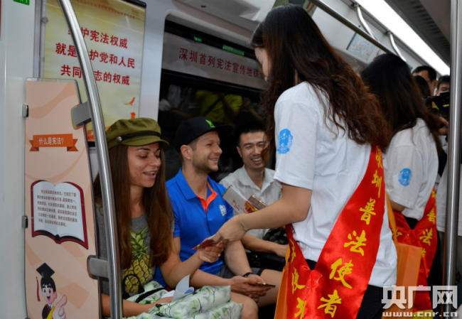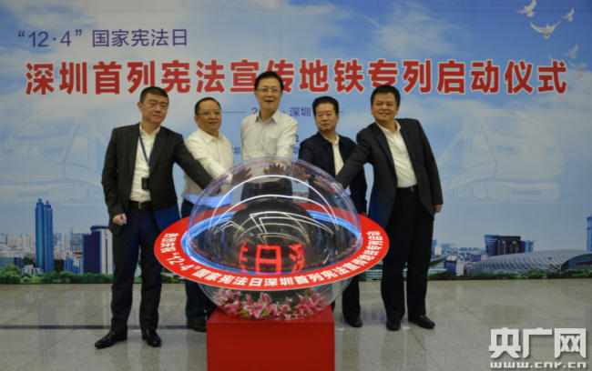 央廣網深圳12月4日消息(記者黃倩 通訊員司新宣)昨天(3日)下午,在第五個“12·4”國家憲法日來臨之際,深圳市普法辦、深圳市司法局、深圳市國資委和深圳市地鐵集團有限公司在深圳地鐵二號線開啟了深圳首列憲法宣傳專列,同時還在地鐵九號線開啟了“掃黑除惡”普法宣傳專列。