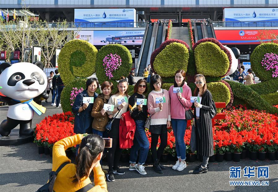 參觀者在中國國際進口博覽會場館前合影(11月10日攝)。在上海舉行的首屆中國國際進口博覽會于11月10日閉幕。新華社記者 李鑫 攝