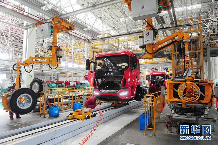 技術工人在安徽江淮汽車集團股份有限公司阜陽分公司江淮汽車總裝車間生產線上組裝卡車(7月12日攝)。新華社發(王彪 攝)
